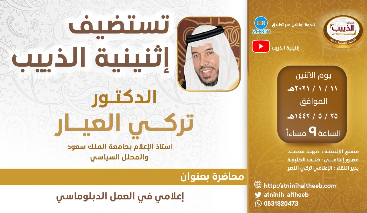 تستضيف إثنينية الذبيب اليوم الاثنين 11-1-2021 م الموافق 25- 5 -1442 هـ ، وفى تمام الساعة التاسعة مساء ، وعبر منصة زووم الافتراضية الدكتور تركي العيار استاذ الإعلام بجامعة الملك سعود والمحلل السياسي ، ومحاضرة بعنوان ( إعلامي في العمل الدبلوماسي ).