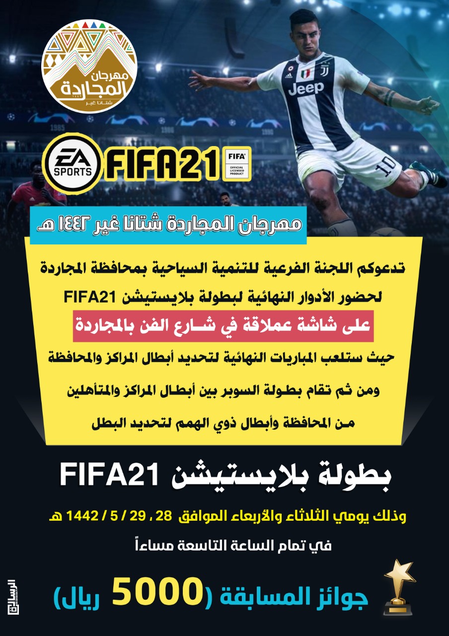 ضمن فعاليات مهرجان المجاردة شتانا غير تدعوكم اللجنة الفرعية للتنمية السياحية بمحافظة المجاردة لحضور الأدوار النهائية لبطولة البلاستيشن FIFA21 على شاشة عملاقة بمسرح شارع الفن بمحافظة المجاردة