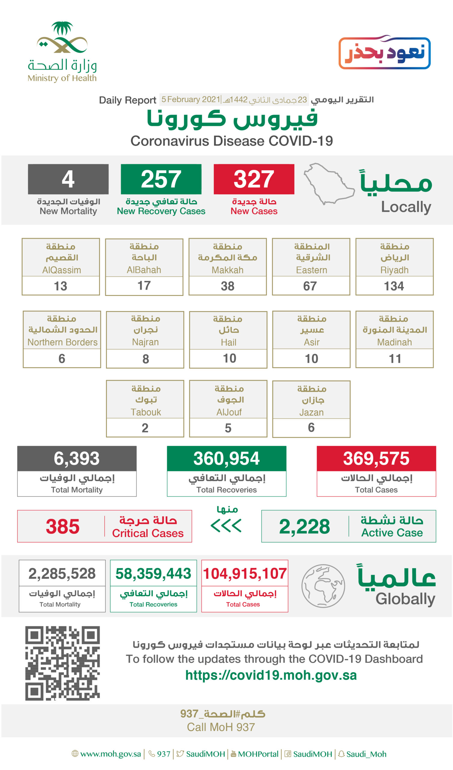 وبذلك يبلغ إجمالى حالات الإصابة بفيروس كورونا بالمملكة 369،575 حالة ، وإجمالى حالات الوفاة 6،393 حالة ، كما أشارت البيانات إلى وجود 2228 حالة نشطة مازالت تتلقى العلاج والرعاية وفقا لبرتوكول العلاج الخاص بكورونا بالمملكة ،بالإضافة إلى وجود 385 حالة حرجة..