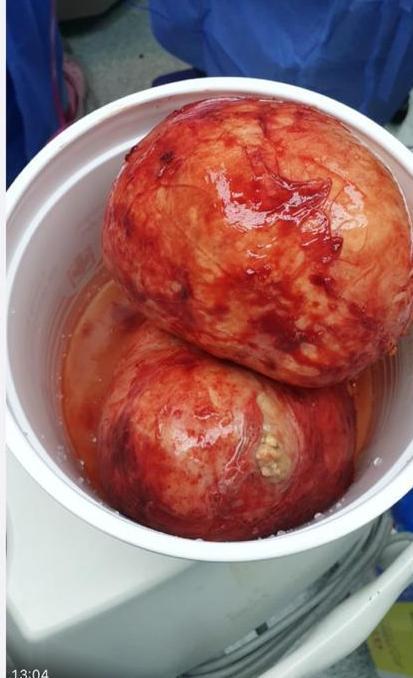 حيث تبين بعد إجراء الفحوصات اللازمة من تحاليل مخبرية وأشعة مقطعية وجود ورم ضخم بحجم 6 كيلو في منطقة الحوض ناشئ من الرحم ، حيث تقرر التدخل الجراحي الفوري وتم إجراء عملية إستئصال أورام ليفية متعددة داخل وخارج الرحم مع الحفاظ على الرحم سليماً .