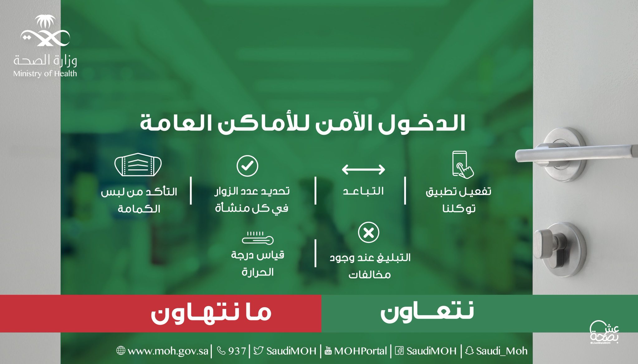 وأوضحت عبر حسابها الرسمي بموقع “تويتر”، أن الدخول الآمن للأماكن العامة، يكون بتفعيل تطبيق توكلنا، والتأكد من تطبيق التباعد الاجتماعي، وتحديد عدد الزوار في كل منشأة، والتأكد من لبس الكمامة، إضافة إلى التبليغ عند وجود أي مخالفات، وقياس الحرارة.