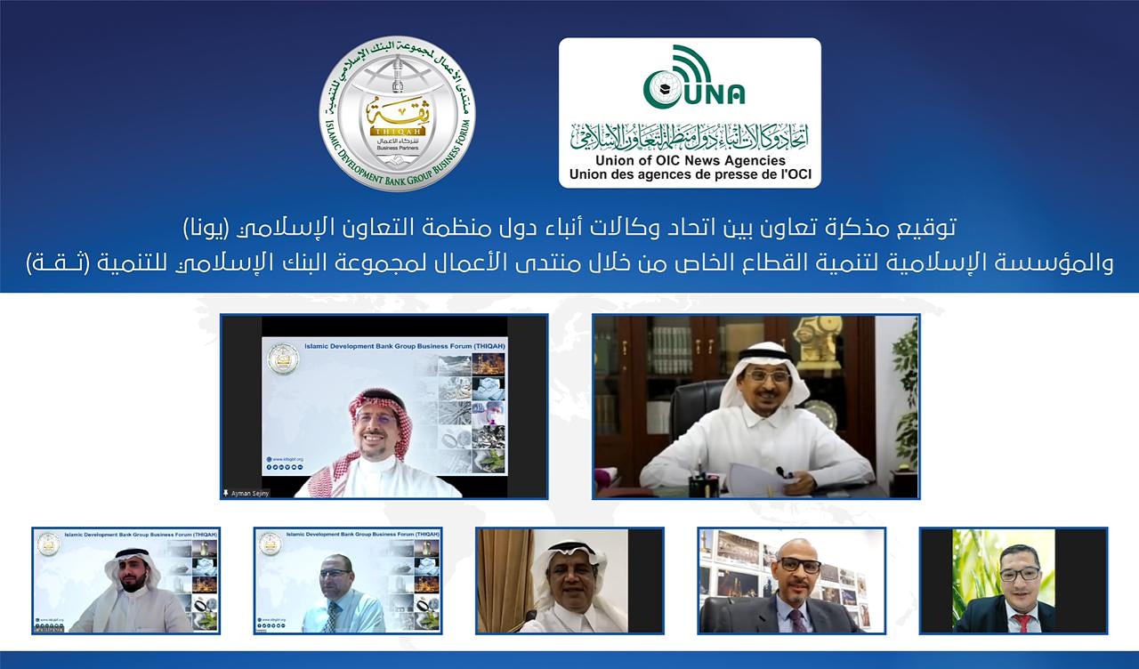وقع اتحاد وكالات أنباء دول منظمة التعاون الإسلامي (UNA) والمؤسسة الإسلامية لتنمية القطاع الخاص (ICD) من خلال منتدى الأعمال لمجموعة البنك الإسلامي للتنمية (ثقة) اليوم، مذكرة تعاون بشأن تحقيق الأهداف المشتركة وخدمة القضايا التي تُسٌهل العمل والتعاون وتعزيز التكامل بين الطرفين .