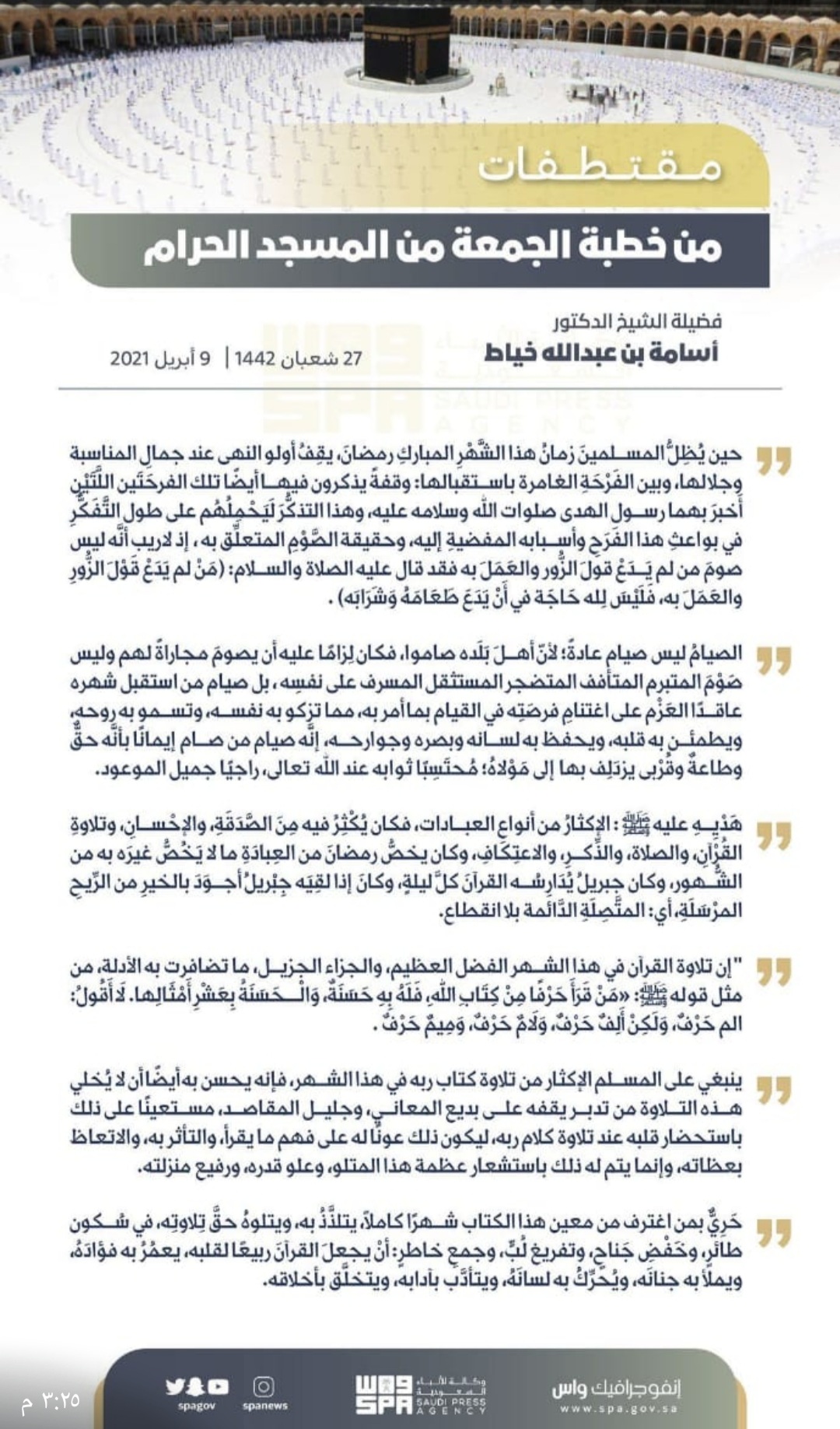 مقتطفات من خطبة الجممة من المسجد الحرام 27 شعبان 11442 9 أبريل 2021 لفضيلة الشيخ الدكتور أسامة بن عبدالل خياط