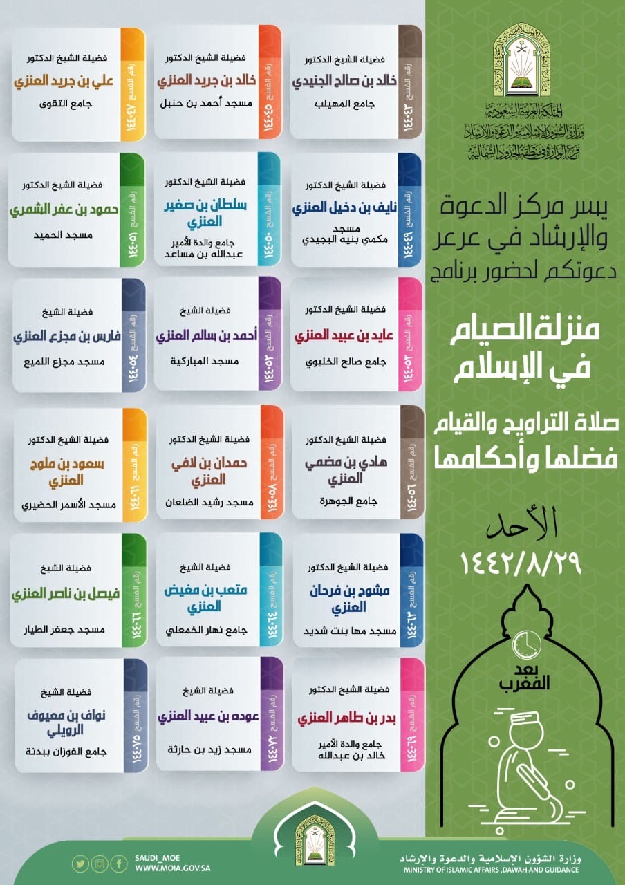 ينظم مركز الدعوة والإرشاد بمدينة عرعر، اليوم، سلسلة من الكلمات الدعوية بعنوان: (صلاة التراويح والقيام فضلها وأحكامها) يلقيها عدد من الدعاة في مساجد وجوامع عرعر بعد صلاة المغرب، حيث تلقى في جوامع المهيلب، والتقوى، ووالدة الأمير عبدالله بن مساعد، وصالح الخليوي، والجوهرة، ونهار الخمعلي، ووالدة الأمير خالد بن عبدالله، والفوزان ببدنة.. كما تلقى في مساجد أحمد بن حنبل، ومكمي البجيدي، والحميد، والمباركية، ومجزع اللميع، ورشيد الضلعان، والأسمر الحضيري، ومها بنت شديد، وجعفر الطيار، وزيد بن حارثة.
