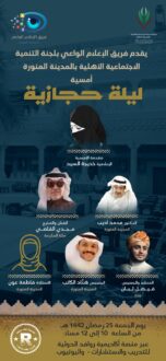 قدم فريق الإعلام الواعي التابع للجنة التنمية الاجتماعية الأهلية بالمدينة المنورة أمسية بعنوان ( ليلة حجازية ) ، والتي تحاكي الماضي والحاضر بمنطقة الحجاز من عادات وتقاليد خلال شهر رمضان المبارك .