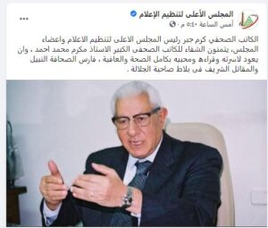 وقد عبر الكاتب الصحفي كرم جبر رئيس المجلس الأعلى لتنظيم الإعلام وأعضاء المجلس، عن خالص أمنياتهم بالشفاء للكاتب الصحفى الكبير الاستاذ مكرم محمد احمد ، وأن يعود لأسرته وقراءه ومحبيه بكامل الصحة والعافية ، فارس الصحافة النبيل والمقاتل الشريف فى بلاط صاحبة الجلالة .