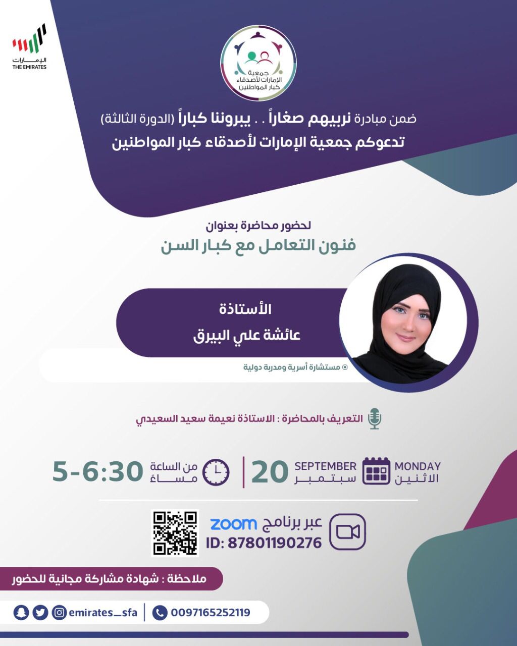 تنظم جمعية الإمارات لأصدقاء كبار المواطنين ضمن مبادرة ( نربيهم صغاراً .. يبروننا كباراً ) في دورتها الثالثة ، و التي تهدف إلى تنشئة جيل واعي بحقوق المسن ومشارك إيجابي في رعايتهم ، وذلك من خلال استضافة نخبة من المحاضرين المختصين في عدة مجالات ، تنظم محاضرة بعنوان(فنون التعامل مع كبار السن ) للأستاذة عائشة علي البيرق – مستشارة أسرية ومدربة دولية