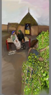 وفي هذه اللوحة جسدت بألوانها وأدواتها الرقمية فترة العصر والعناصر الموجودة من سيدات الزمن الجميل والانشغال والحركة في فترة العصرية من إخراج الكراسي من العشة (القُعُد ) أو القعادة إلى الطراحة “القبل ” للجلوس عليها والبسطة في الهواء الطلق العليل ولقلة الأثاث طبعا وبعد شروق الشمس ترجع جميع القُعُد إلى داخل العشب أو المجلس .