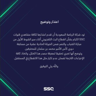 وذكرت الشركة عبر حسابها الرسمي على موقع “تويتر”:” تود شركة الرياضة السعودية أن تقدم اعتذارها لكافة مشاهدي قنوات ssc الكرام بشأن انقطاع البث التلفزيوني أثناء سير الشوط الأول من مواجهة الشباب والنصر ضمن الجولة الـ 11 بدوري المحترفين.