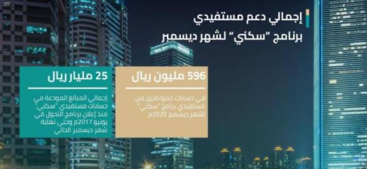 وأوضح المشرف العام على الصندوق منصور بن ماضي، أن إجمالي الدعم لشهر ديسمبر بلغ 596 مليون ريال، وخصص دعماً لأرباح عقود التمويل العقاري السكني للأسر، مبيناً أن إجمالي ما تم إيداعه في حسابات مستفيدي سكني منذ إعلان برنامج تحول الصندوق في يونيو 2017 وحتى نهاية 2020، تجاوز 25 مليار ريال.